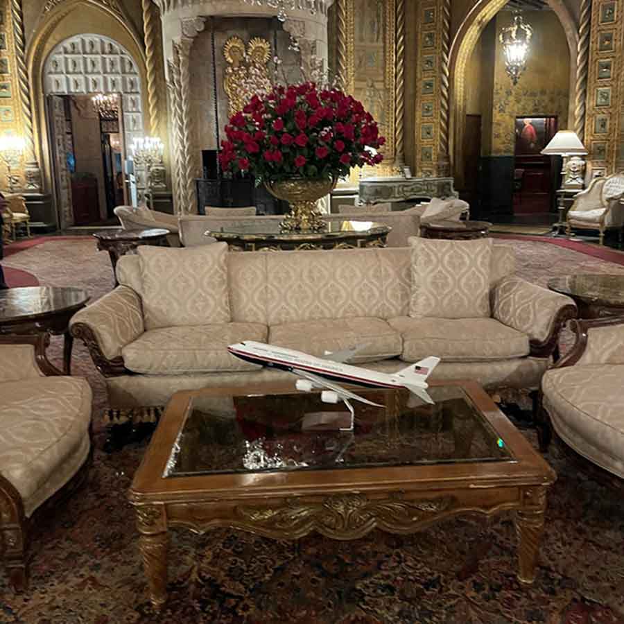 While in office, Trump tried to repaint Air Force One red, white and blue. Like a lot of his worst ideas, that never happened, but he did have a model of the plane that he kept in the Oval Office and that often appeared in official photos with world leaders. He apparently really liked the souvenir, because instead of leaving it behind for Biden, Trump packed it up and brought it down to Mar-a-Lago, where it’s now prominently displayed on a coffee table in the lobby.